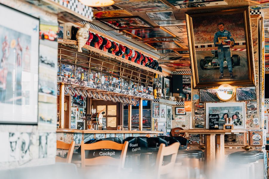 In der legendären Cockpit Bar können Sie zwischen Andenken aus über fast 100 Jahre Nürburgring den Tag ausklingen lassen.
